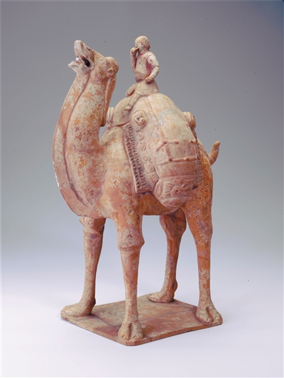此件为山西博物院藏。骆驼昂首站立在长方形的托板上,双峰间垫着毯子,驮着丝绢、皮囊等物品,皮囊上坐着一人,头上戴着圆毡帽。有趣的是,他的手里还抓着一个饼子,正在边走边吃。仔细观察发现,这位胡商手里的饼子,当地称为“馕”,传入中原后,被称为“胡饼”。骆驼背上所驮的货物是当时贸易往来中的大宗商品丝绸和绢帛等纺织品。