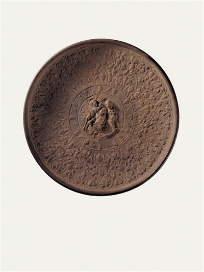 此件为甘肃省博物馆藏,银盘曾表面鎏金,现已大部分脱落。盘内满饰浮雕花纹,纹饰分为三个区域:外圈饰十六组相互勾连的葡萄卷草纹,其间栖有小鸟等小动物;中间一圈浮雕呈环带状,内列十二个人头像,每个头像左侧各有一只动物;盘中央图案为一倚坐于狮豹类猛兽背部的青年男性,是银盘的主题花纹。这是在中国境内丝绸之路上发现的重要罗马文物。