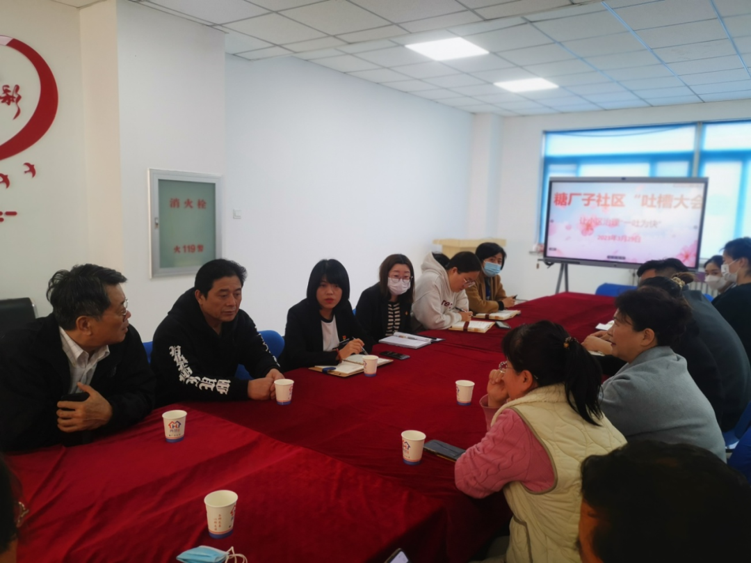 “‘吐槽大会’的目的是为社区开展资源内循环,实现社区共建共享共荣......”3月29日,浑河站东街道糖厂子社区第四次“吐槽大会”如期举行,社区书记在现场介绍说:“本次‘吐槽大会’不仅有辖区五个小区的业主代表,还有区里和街道的相关领导,也邀请了市、区人大代表参加,大家一起听取居民心声,对居民提出的问题进行现场解答,沟通协调,对后续问题积极跟踪推进。”
