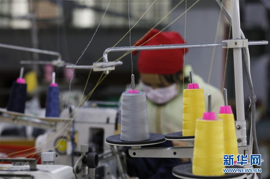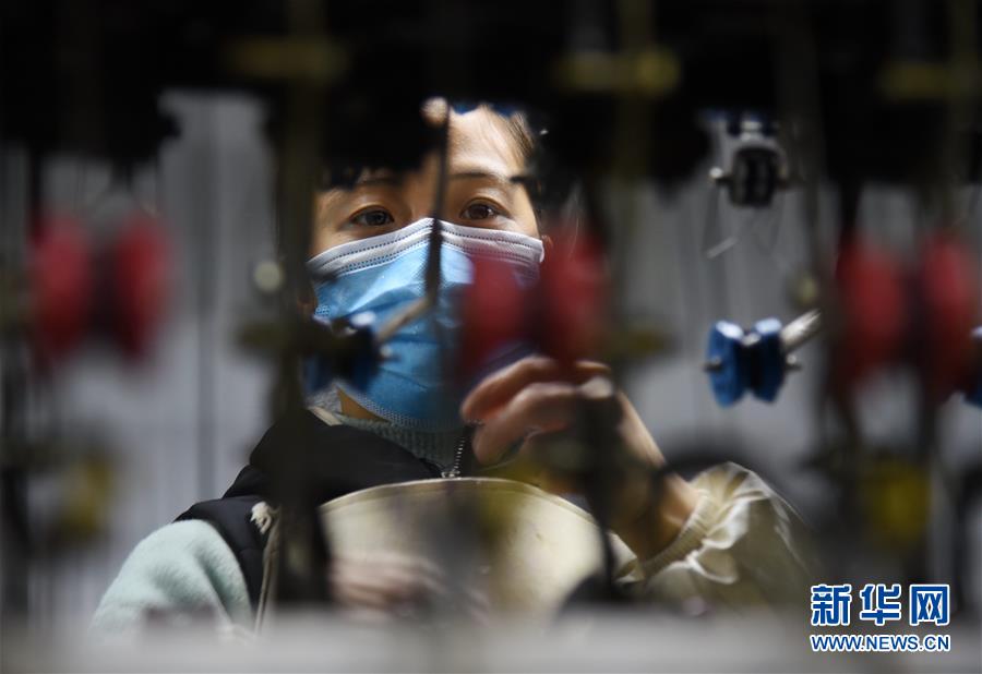 3月3日,在贵州省黔东南苗族侗族自治州榕江县工业园区一家纺织企业,工人在生产线上作业。 近日,多地企业在做好疫情防控工作的基础上组织工人有序复工,抓紧生产。 新华社发(刘进银 摄)