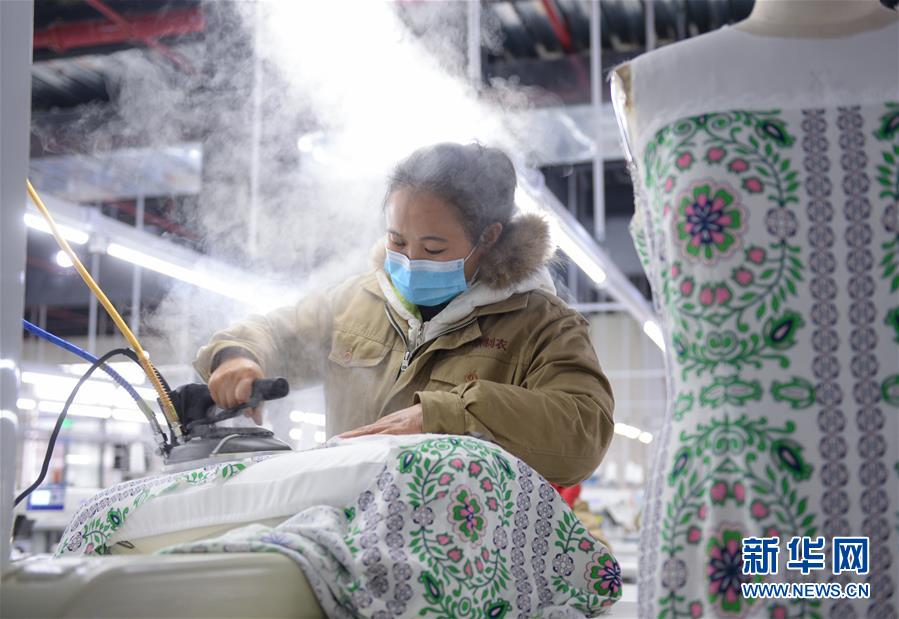 3月3日,在贵州省黔东南苗族侗族自治州天柱县联山街道易地扶贫搬迁安置点的扶贫车间内,工人在熨烫衣服。 近日,多地企业在做好疫情防控工作的基础上组织工人有序复工,抓紧生产。 新华社发(潘德玉 摄)