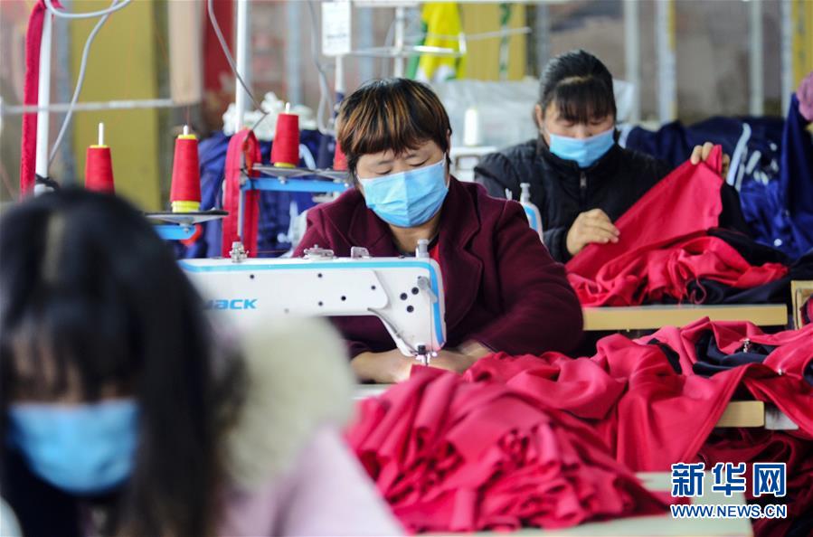 3月3日,在贵州省黔东南苗族侗族自治州锦屏县三江镇潘寨村,工人在一个易地移民安置小区的扶贫车间里加工服饰。 近日,多地企业在做好疫情防控工作的基础上组织工人有序复工,抓紧生产。 新华社发(刘光英 摄)