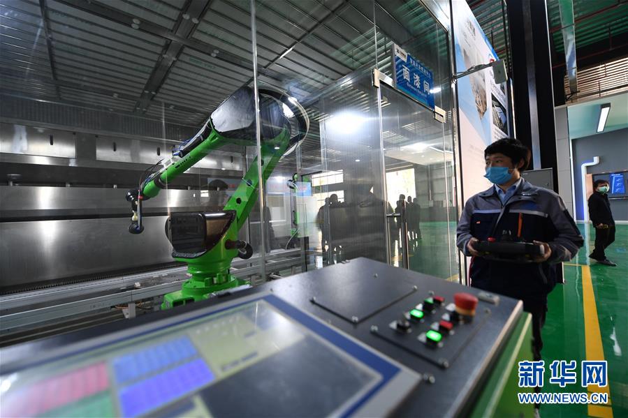 2月26日,在赣州市南康家具产业园,工人操作智能喷涂机器人进行喷漆。 新华社记者 胡晨欢 摄