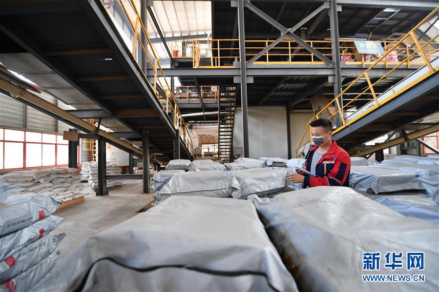 2月26日,在赣州市南康家具产业园,工人清点制作刨花板所用的化工原料。 新华社记者 胡晨欢 摄