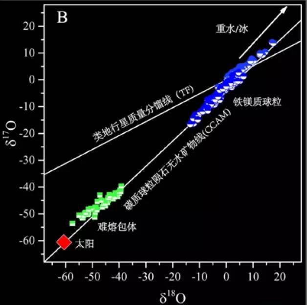 难熔包体是太阳系最古老的物质(4567 Ma,百万年),被认为形成于原始太阳附近(<0.1 AU, AU即天文单位,约等于地球到太阳的距离),具有与太阳类似的氧同位素组成(Δ17O=-23‰到-28‰;图2)。
