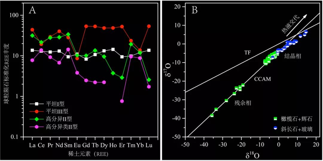 更重要是,科研人员研究发现了四种难熔包体特有的REE配分模式(I型、II型和类II型、III型)(图4A)和三种难熔包体来源的残余矿物(橄榄石、尖晶石和透辉石),显著丰富了混入富铝球粒初始物质中的难熔包体种类的多样性。此外,富铝球粒结晶矿物的氧同位素组成与铁镁质球粒相同(Δ17O~-5‰,图4B),指示两者在相同区域熔融。