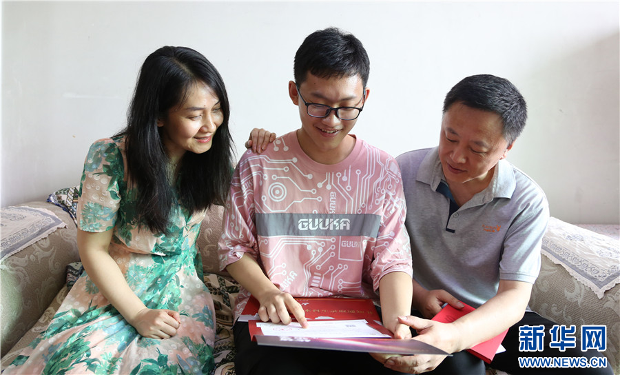 图为一家三口拆开国科大录取通知书。新华网刘舒摄