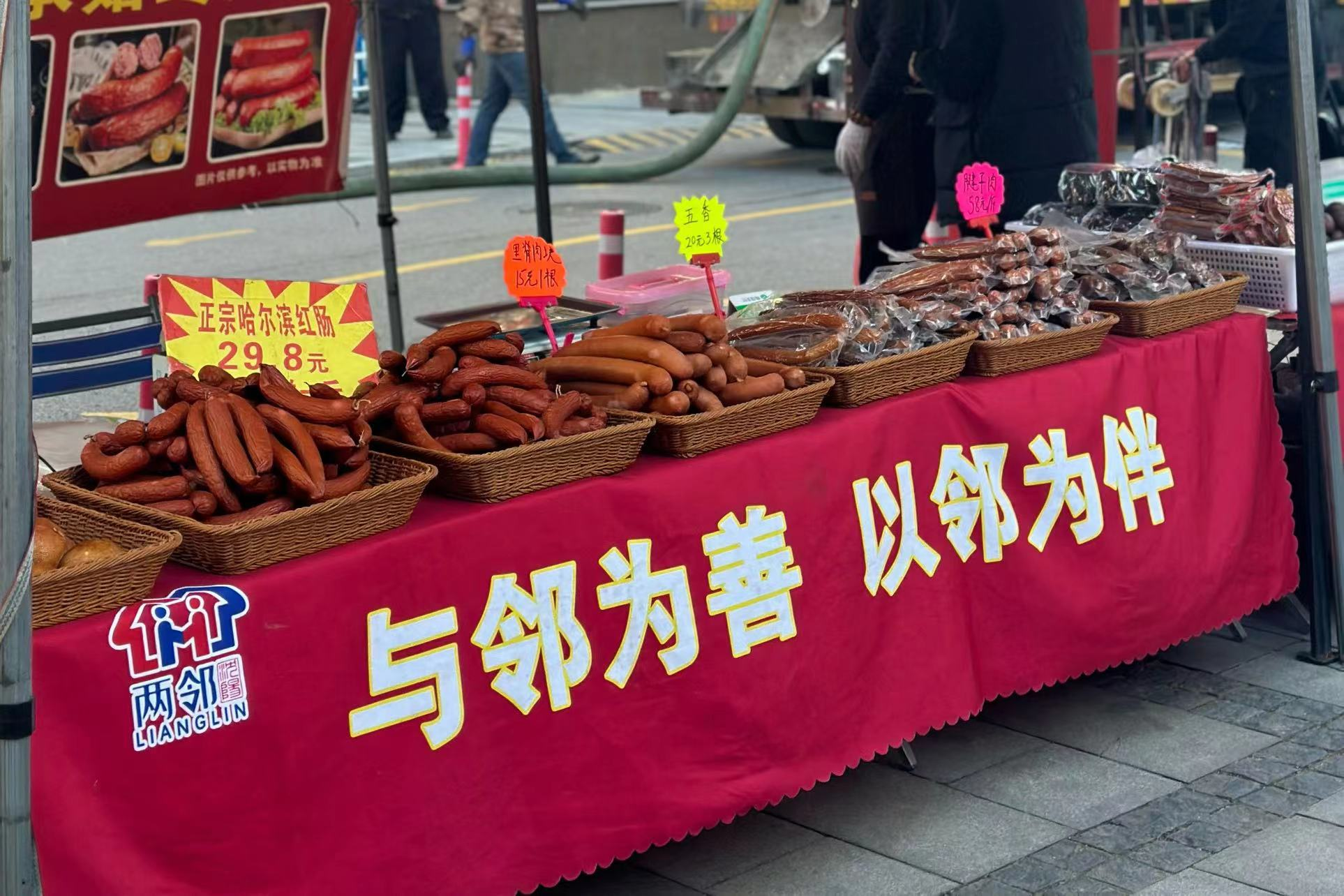 摊位从东到西一字排开,内蒙古牛肉干、沈飞大面包、高钙羊奶粉、免费棉花糖、哈尔滨红肠,特价家纺、服饰等商品琳琅满目,摊位老板们热情招呼着前来采购的居民,现场充满了浓浓的烟火气。