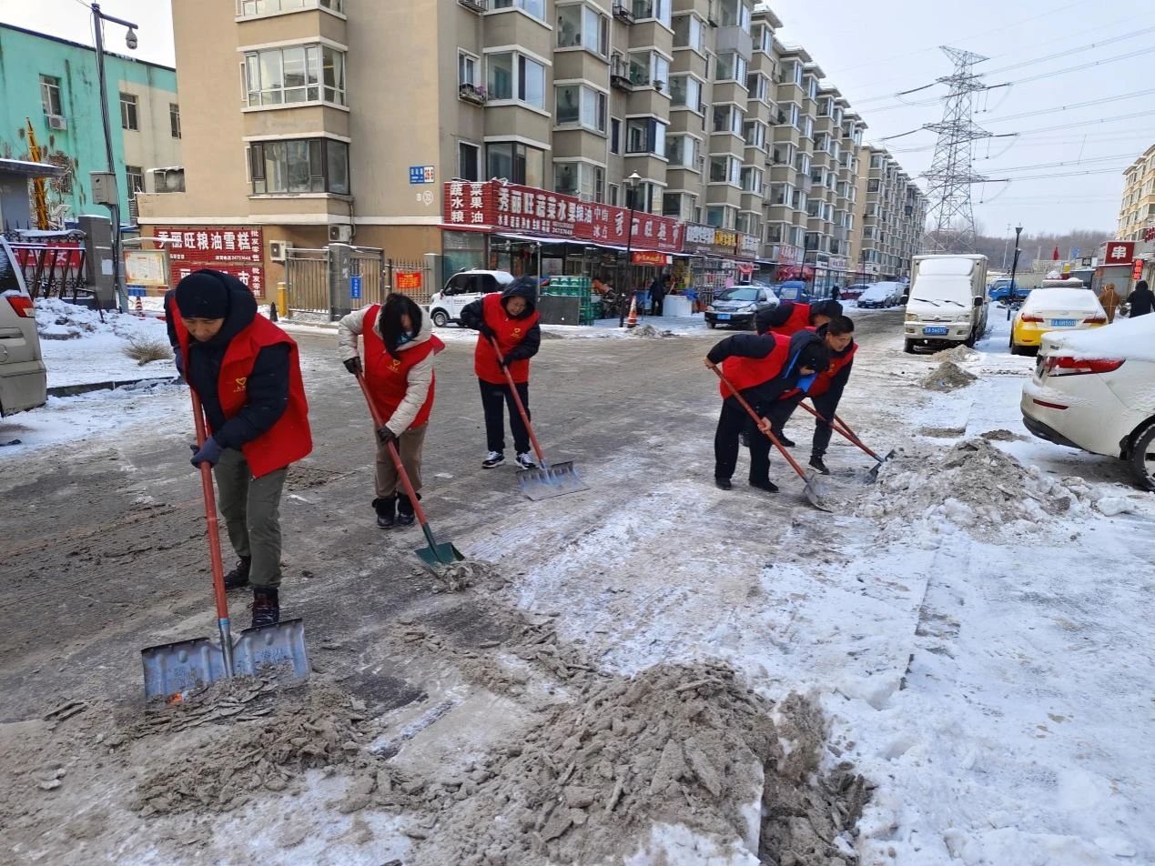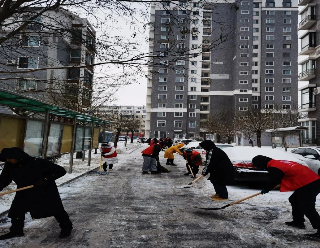 在白塔街道茗居社区,社区工作者和沈阳城市建设学院信息与控制工程学院学生以饱满的劳动热情、昂扬的精神风貌,积极投入到“铲雪破冰”的行动中。他们有的拿起扫帚、有的挥舞着手中的铲雪板,先清雪、再除冰,打扫起来井然有序、配合默契,不一会儿的工夫,就清理出了一大片路面,为居民出行提供了便利条件。