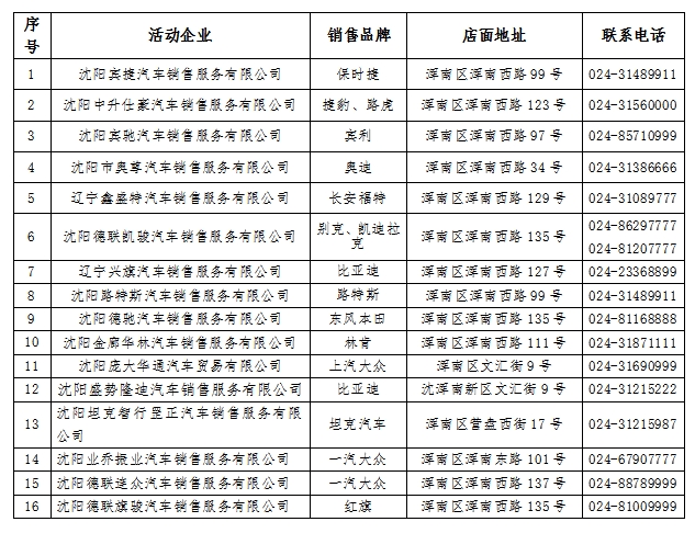 “2024爱上浑南—冬日献礼”购车节参与车企名单