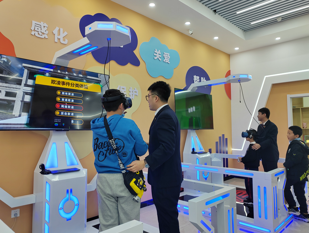 VR法治体验区和案例解析互动大屏幕是孩子们最喜欢的两个区域。在VR法治体验区,孩子们佩戴上虚拟现实眼镜,以主角的身份进入到防校园欺凌、防电信诈骗、防性侵害、禁毒等主题场景中,沉浸式地学习相关法律知识以及如何保护自身安全。在案例解析互动大屏幕前,孩子们根据设备演绎的案例回答问题,系统根据孩子们的回答展示相应的法律后果,通过“问答互动”的形式让孩子们深刻理解法律知识。