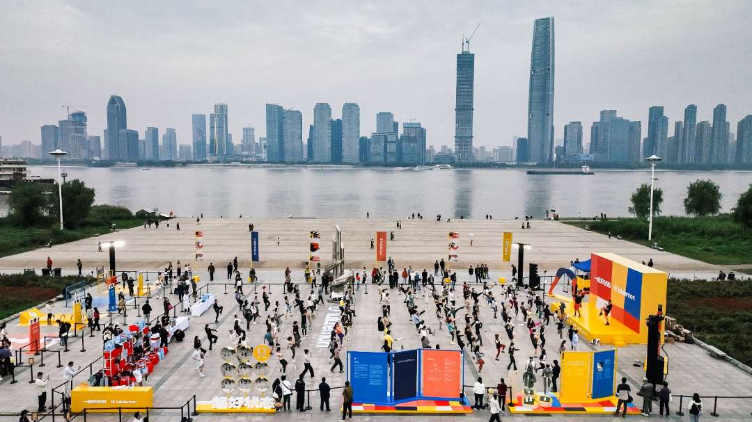 在武汉汉口江滩三阳广场,江畔运动热情与浩荡长江共振,从清晨到夜晚,客人们在运动中感受身心合一,感知武汉的幸福脉动。